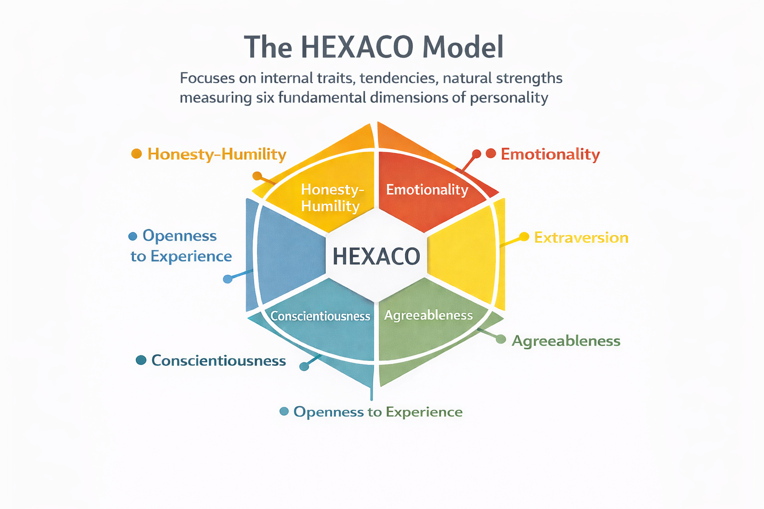 The HEXACO model focus on internal traits, tendencies, natural strengths measuring 6 fundamental dimensions of personality