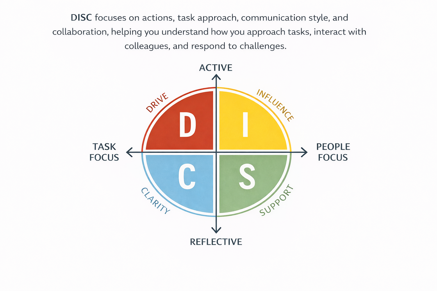DISC focus on actions, task approach, communication style, collaboration helping to understand how you approach tasks, interact with colleagues, and respond to challenges.